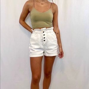 These high-rise denim shorts have a paperbag waist, four-button closure, and a cuffed hem.