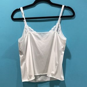 White flower lace on the trim with adjustable straps. Fits closer to a small/medium.