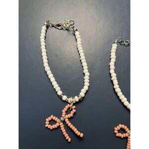 White, Silver, Pink Beaded Bow and Beaded Adjustable Friendship Bracelet Set
