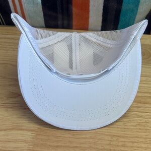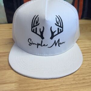 White cap with 'Simple Man' logo. Features a stylish antler design.