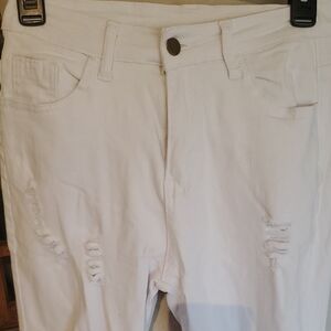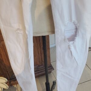 These white skinny jeans feature a high-waisted design and distressed details for a modern, edgy look. The stretchy denim fabric ensures a comfortable fit, making them a versatile choice for casual outings.
