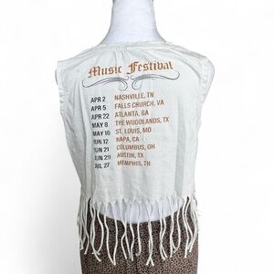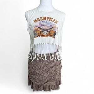 This white sleeveless crop top features a trendy muscle tee design, perfect for casual outings. The top showcases a Nashville-themed graphic with guitars and western imagery in brown tones, adding a unique touch. Its lightweight fabric and fringe details at the hem make it ideal for music festivals and relaxed gatherings.