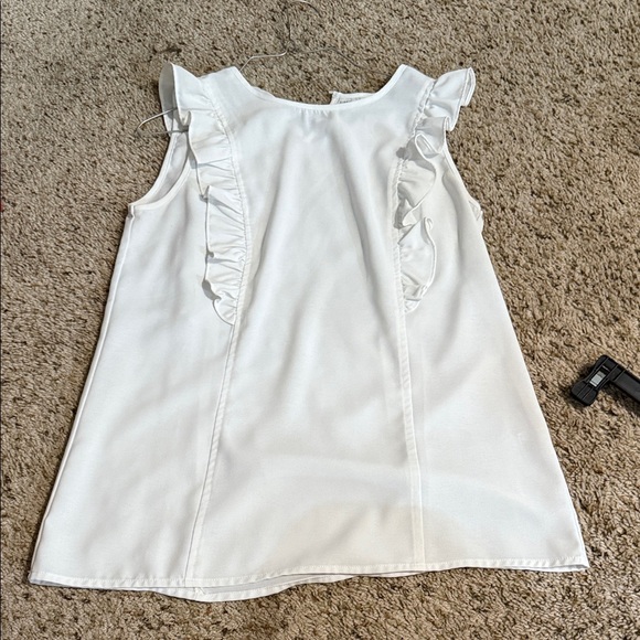 Chic white sleeveless top with ruffle details. Perfect for any occasion.