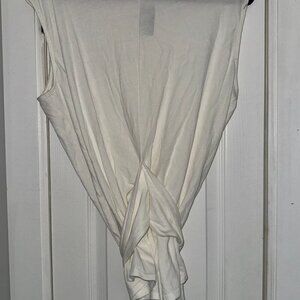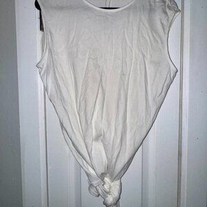 Simple but stylish white sleeveless top with extra-long front ties you can knot or bow for a flattering cinched waist look. Lightweight with soft stretch. Super versatile—wear it loose or styled. Great for layering or on its own!