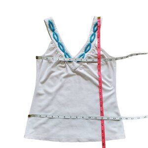 Elegant white sleeveless top featuring intricate blue embroidery. Perfect for a stylish and comfortable look.
