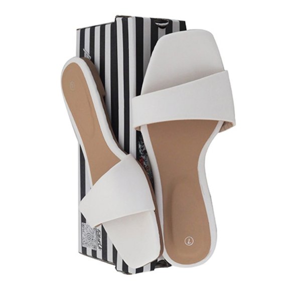 Effortless slide sandals are an excellent choice for warm-weather days. Easy to wear, soft vegan leather shapes a single band atop a peep-toe upper with a cushion heel pad.