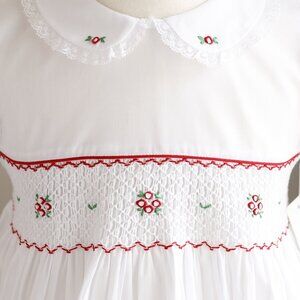 This New Feltman Brothers Girl's White Heirloom Dress is heavenly! The Vintage style dress is a classic! The bodice is adorned with gorgeous smocking done in a lattice design in all white embroidery. Sweet embroidered red and white Bullion Roses with green leaves, sit atop the lattice design. A chevron pattern borders the top and bottom of the smocked panel, with a red petit piping finishing the top edge. The sweet Peter Pan collar is embellished with a delicate white French Lace. A single matching red and white bullion rose with green leaves sits on each side. The short puff sleeves gather and finish with a banded hem.Just above the skirt hem are 4 horizontal rows of pintucks. Upper Button back and a tie back sash for a perfect fit! Your girl will look like an angel in this sweet white dress. Perfect for little Flower Girls or for special events. Timeless and Classy Vintage design! NWT- PERFECT and New!!