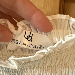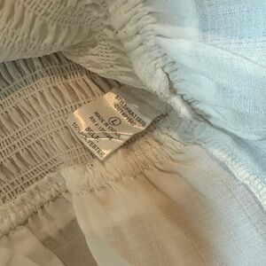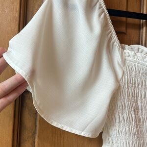 This off-white smocked top features a flattering square neckline and stylish flutter sleeves. Crop length hits at or above belly button. Size is large but smocked waist fits more like a medium, but it does stretch.