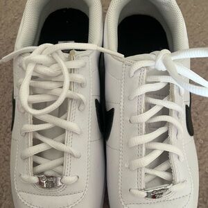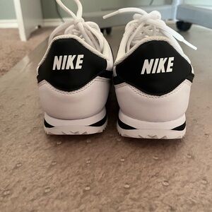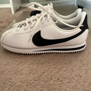 Stylish white sneakers featuring black accents. Perfect for casual wear. Nike Men’s Cortez Size 7.