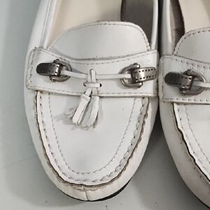 White Soft Leather Loafers with Tassels and Pewter Metal Ornament Rubber Soles