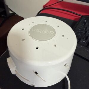 Compact white sound machine with power switch. Ideal for relaxation and sleep.