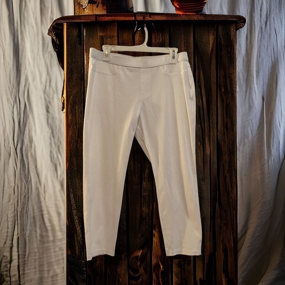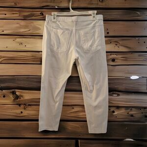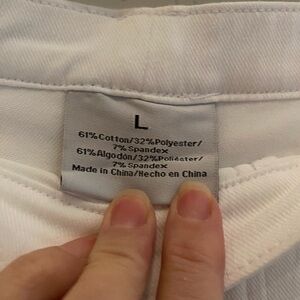 I bought these and they were too big, so they are brand new. No stains. Only been hanging in my closet. They have a lot of stretch and have a Jean like look to them. Please see all photos as part of the description.