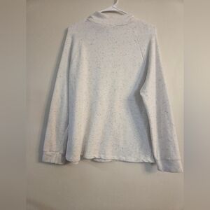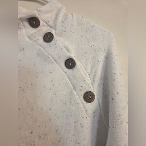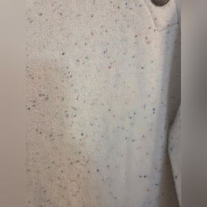 Cozy white sweater with speckled design and button details on the shoulder. Some small pilling noticed but nothing too bad. In over all good shape with general signs its been washed but no holes ect.