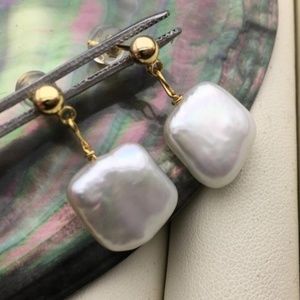 White Square Shaped NATURAL Pearl Drops - 14K Yellow Gold Plate