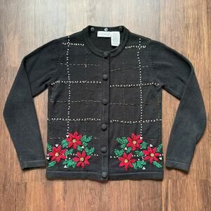 White Stag Black Poinsettia Embroidered Holiday Cardigan Women’s Small