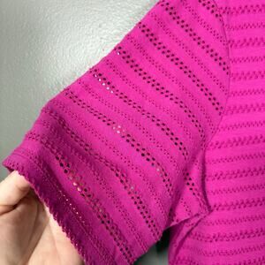 Women's plus size boho top by White Stag. This bright pink top has short sleeves, crochet eyelet lace stripes along the front, and a scoop neck. It is a cotton, polyester, spandex blend with a cotton polyester lining.