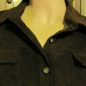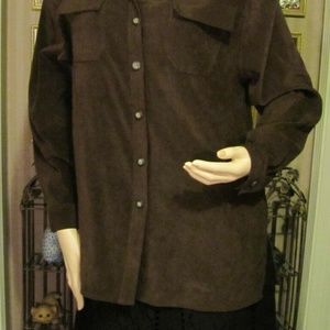 Very nice top by White Stag in size Med. Dark brown & done in a lovely plush suede looking texture. Buttons up the front & sleeves cuffs button too. Outside feels nice & soft & inside feels almost silky. Looks great as layered look & could easily be worn as a light weight jacket. Polyester spandex. Measures....43" around chest ....41" in waist....44" around hem....about 29" in length (4 1/2" slits on sides)...sleeve length is 23" from top seam & 17 1/2" from under arm seam. Excellent condition.