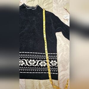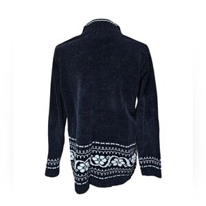 This vintage White Stag sweater is a cozy addition to your winter wardrobe. The black and white cardigan features a floral pattern and a turtleneck neckline. The long sleeves and classic fit make it perfect for travel, parties, or even workwear.