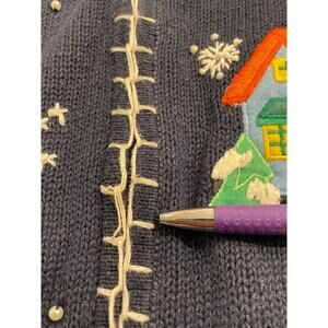 Depicts several christmas scenes, all of which are embroidered / appliqued.