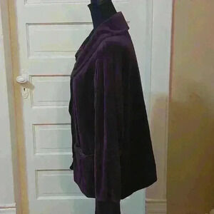 Royal purple velour. 2 pockets in front with easy to use buttons. Collar can button to create a warm cowl collar. Size XL 16/18. Pit to pit measures 24". Sleeves from top of shoulder to cuff 24" Length.