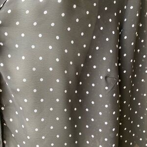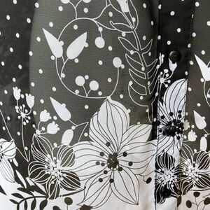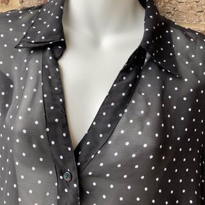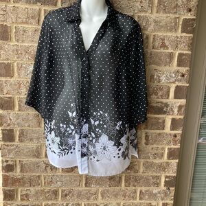 White stag button down blouse. Simply stunning. Gorgeous. Size 1X/16 W. 100% polyester. Armpit to armpit measures 23 inches. Shoulder to hem line 25 inches. White and black Polkadot floral design.