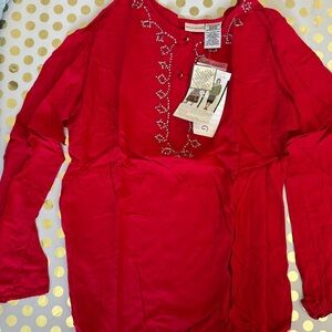 This elegant blouse by White Stag features a rich red hue with intricate silver embellishments around the neckline, adding a touch of sophistication. The long sleeves are designed with subtle ruffle details at the cuffs, enhancing its stylish appeal. Perfect for special occasions, this top combines luxury and elegance effortlessly.