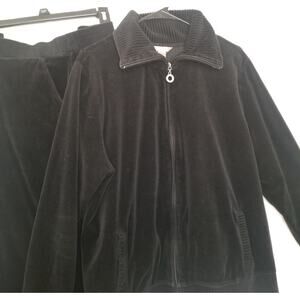 White Stag Tracksuit Black Velour Set Cozy Velvety Set; Top Size XXL, Pants Size XLP; Color Jet Black, Material - Top & Pants 76% Cotton, 24% Polyester; Care - Machine Wash Cold Gentle; Made in Indonesia; Top - Long Sleeves, Ribbed Banding Sleeve Ends and Neck, 2 Pockets, Zip up Front, Crystal Zip Pull, Elastic Waist