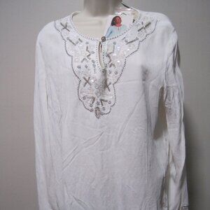 White Stag V-Neck Embroidered White Linen/Rayon Long Sleeve Top Blouse, Large