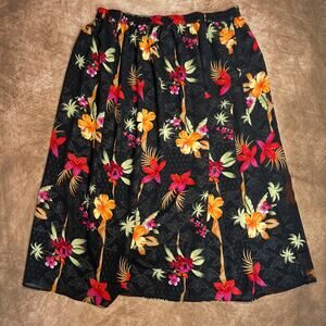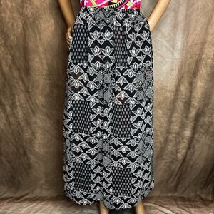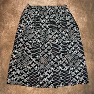 Long skirt is reversible with a black and white patch work paisley geometric pattern on one side, and a multicolor flower print on the other. Elastic waistband, mesh style material so that opposite side can be seen under top laayer.