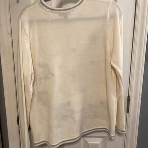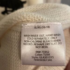 Great condition white Christmas sweater! Size XL/XG (16-18). Has a fun design with Santa's sleigh and reindeer. Wash inside out, hand wash cold separately. Non-chlorine bleach when needed. Reshape dry flat. Do not iron.