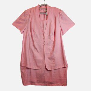A versatile and elegant two-piece set featuring a short-sleeve jacket with floral embroidery and a matching sleeveless dress. Soft rayon blend fabric.