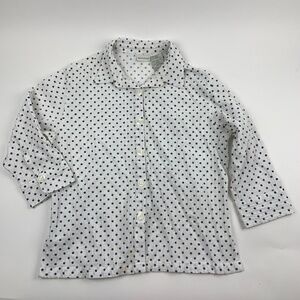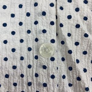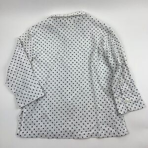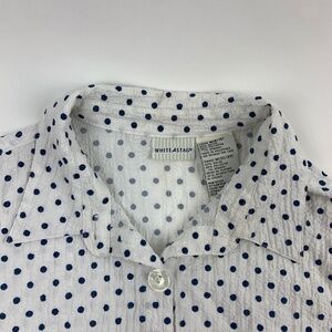 White Stag Womens Button Down Shirt Quarter Sleeve White with Blue Polka Dots. Has stain on bottom front of shirt.