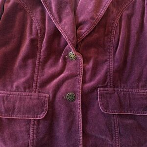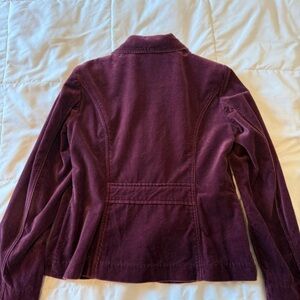Elegant plum blazer with classic lapel. Button closure and front pockets. Perfect for versatile styling.