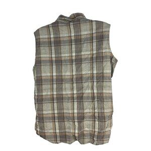 Stylish women's sleeveless plaid blouse by White Stag in size large. Features a button-front design, collared neckline, and a casual yet tailored look. Composed of 100% cotton for breathable wear, the muted plaid pattern offers versatile styling options. Designed for comfort, this blouse is fully machine washable.