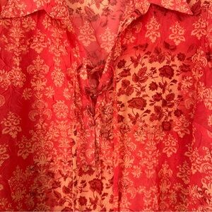 This White Stag women's top in plus size 14W features a vibrant orange color with a sheer floral textured design. The top has a stylish lace-up front detail, a V-neckline, and long sleeves with a casual sleeve type. Made of polyester chiffon fabric, this blouse is perfect for casual or travel occasions in the summer, fall, or spring seasons.