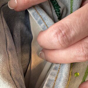 Small stain near floral embroidery. Measurements: Shoulder to shoulder = 19.5 inches, Top to bottom = 24.25 inches, Bust = 25 inches.