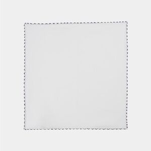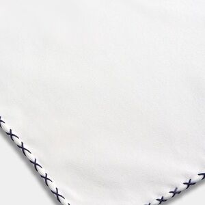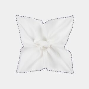 This white pocket square is made from a cotton silk blend woven by the Italian mill Silkpro and features a navy cross stitched edge.