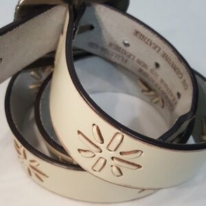 This is a white leather belt with silver buckle. White stitched "flowers" down the belt. Small cracking on two holes.