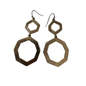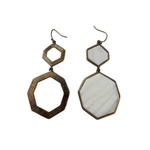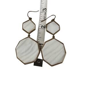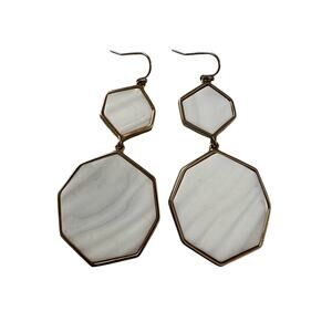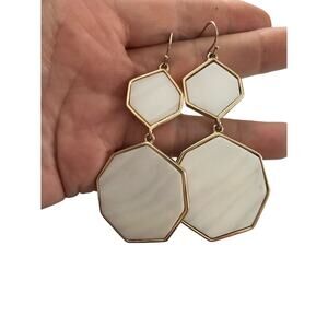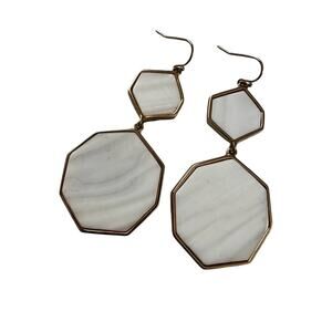 Classic, elegant, gold and white stone geometric earrings. Dangle and drops with goldtone frames around white real stone hexagon shapes. These earrings have weight and movement. The white and gold and classy and glamorous and goes with just about anything. They measure 2 3/4" long by 1 1/4" wide.