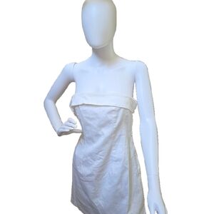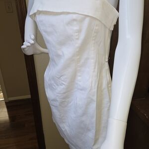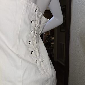 This elegant white strapless dress is perfect for any occasion. Its sleek design offers a timeless look that is both stylish and versatile. this zips up the side and has a lace-up back strapless size medium with a little stretch I show this with a Halo on one of the pictures it be so cute with some wings or even a nurse costume