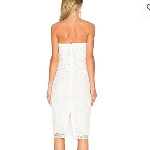 Self & Lining: 100% poly. Dry clean only. Fully lined. Allover lace fabric. Flounce bodice overlay. Hidden back zipper closure. Back slit. Neckline to hem measures approx 35" in length