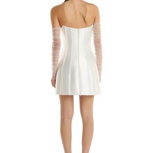 The Kayla Dress features a well-defined and fitted corset bodice effortlessly cascading into a full mini skirt adorned with elongating pearl embellishments in the seams. The elegance continues with gathered pearl mesh detachable sleeves. Fully lined with an invisible zipper at the centre back, the Kayla Dress embodies timeless beauty and contemporary sophistication.