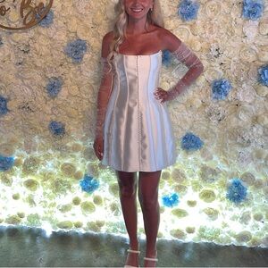 This elegant white strapless dress features delicate pearl embellishments and detachable sheer sleeves, perfect for any bridal occasion.