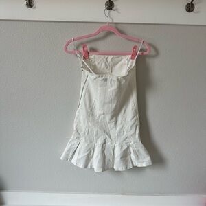 Strapless white stretchy denim mini dress with pleated bottom, says medium but could also fit a small