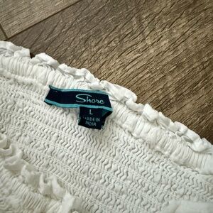 Strapless white mini romper with a smocked bodice. Tiered ruffle skirt with tie detail at the waist. Lightweight and breezy. Feminine and versatile.