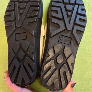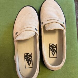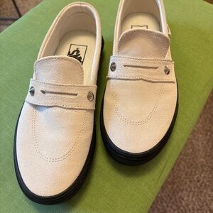 Brand New White suede with black rubber loafer style Vans with studs. Size US Men’s 6/ Women’s 7.5