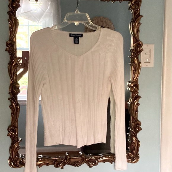 Beautiful white Evan Picone size M button down, boat neck sweater. Delicate white embroidery adorns the shoulder area of this sweet sweater.