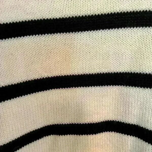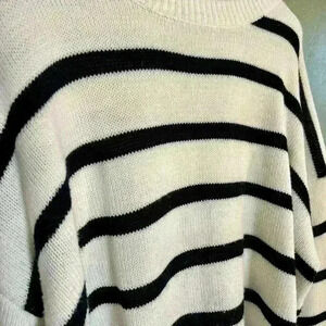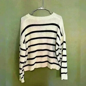 White sweater with black stripes, size L. Pit to pit: 24” Length: 22” Size: Large **Please see all pics for signs of wear and/or flaws. Any notable flaws will be listed above. Preowned items are sold as is. Please feel free to message with any questions. ** I am selling from a pet friendly, smoke free environment. All measurements are approximate.