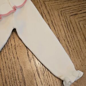 Charming white sweater featuring pink ruffle accents. Perfect for a stylish look.