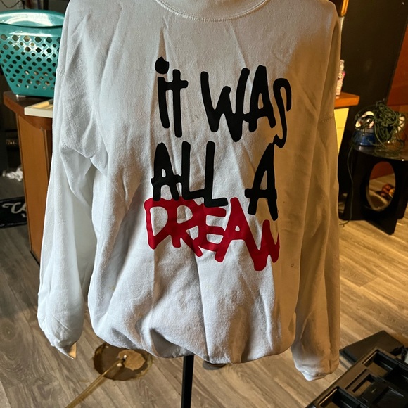 Stylish white sweatshirt featuring bold black and red text design. Perfect for casual wear.
